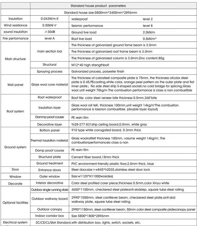 – Main structural modules (container frame, wall panels, roof panels)**, which are prefabricated steel structures with standardized dimensions, featuring high strength and durability to ensure structural stability.